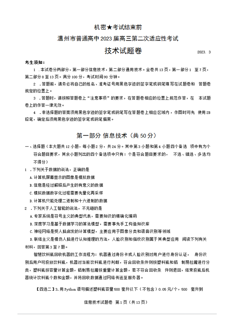 高三技术--浙江省温州市普通高中2023届高三第二次适应性考试
