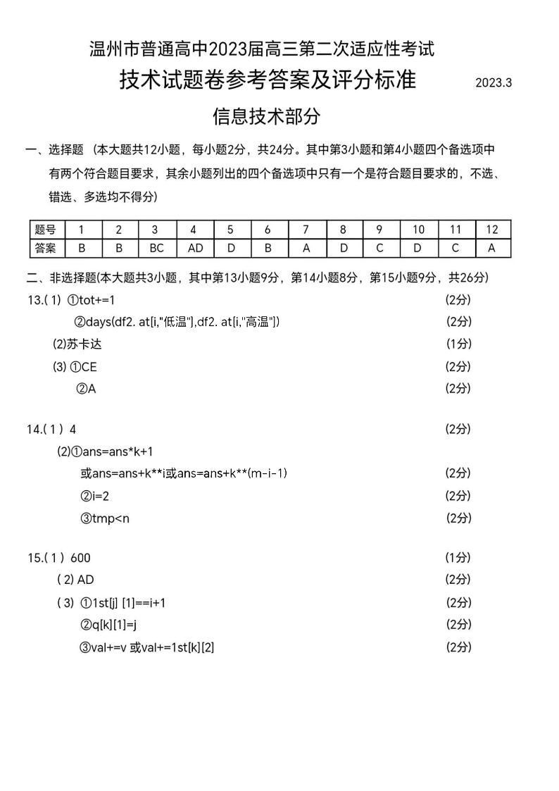 高三技术答案--浙江省温州市普通高中2023届高三第二次适应性考试