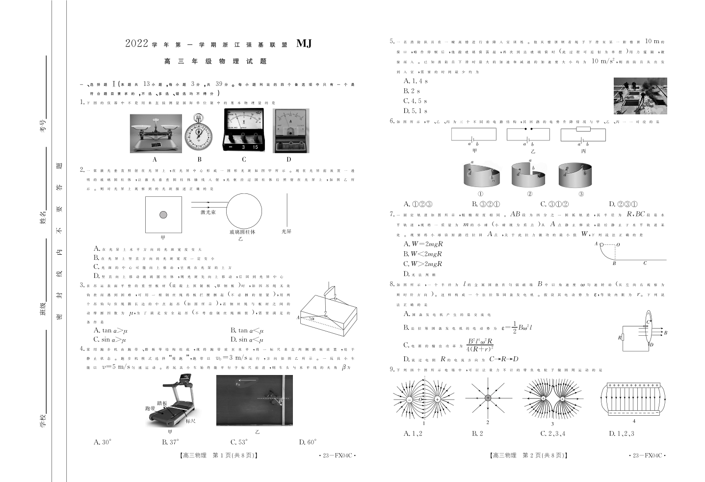 高三物理--浙江省强基联盟2023届高三上学期选考仿真密卷