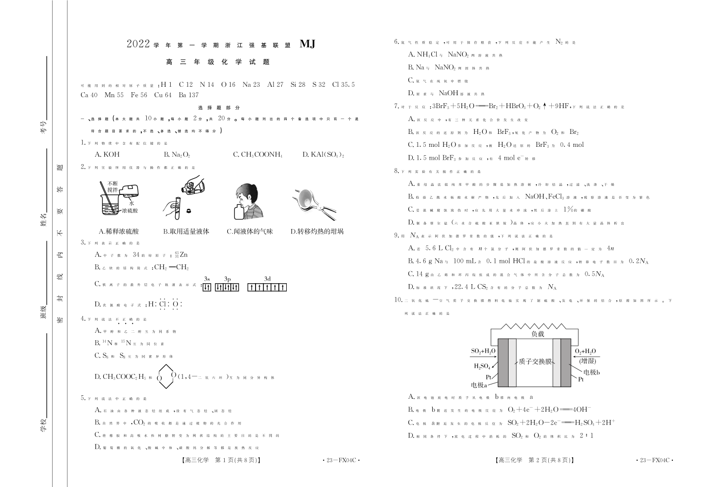 高三化学--浙江省强基联盟2023届高三上学期选考仿真密卷