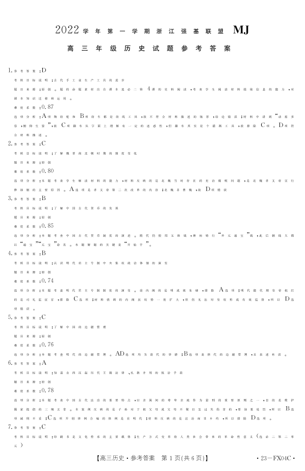 高三历史答案--浙江省强基联盟2023届高三上学期选考仿真密卷