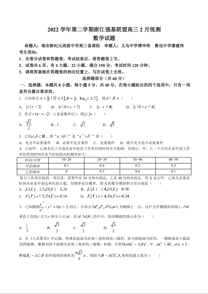 高三数学+答案--浙江省强基联盟2022-2023学年高三下学期2月统测