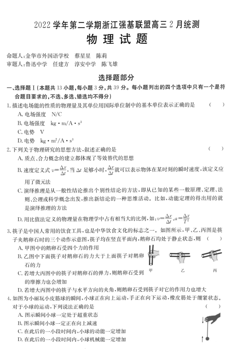 高三物理+答案--浙江省强基联盟2022-2023学年高三下学期2月统测