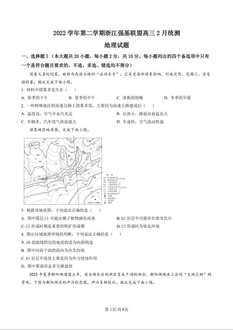 高三地理(原卷版)--浙江省强基联盟2022-2023学年高三下学期2月统测