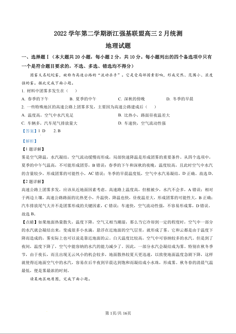 高三地理(解析版)--浙江省强基联盟2022-2023学年高三下学期2月统测