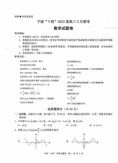 高三数学--浙江省宁波市十校2023届高三下学期3月(二模)