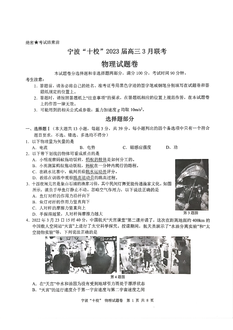 高三物理--浙江省宁波市十校2023届高三下学期3月(二模)