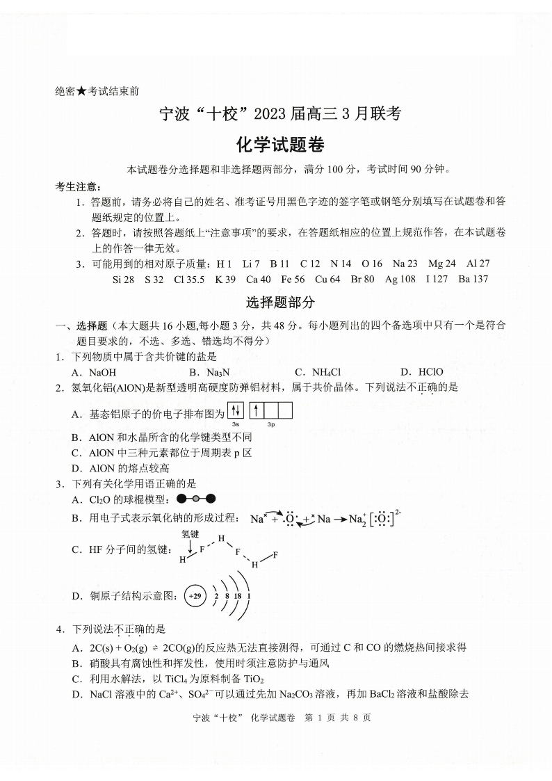 高三化学--浙江省宁波市十校2023届高三下学期3月(二模)