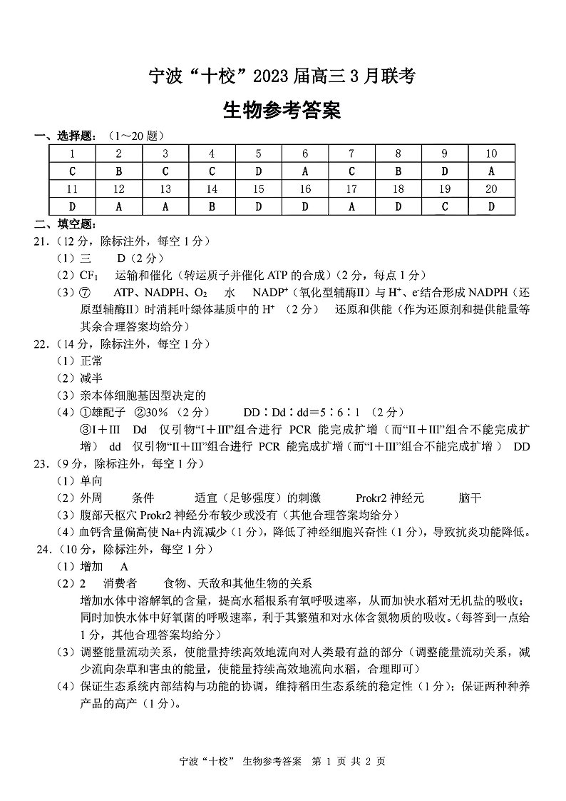 高三生物答案--浙江省宁波市十校2023届高三下学期3月(二模)