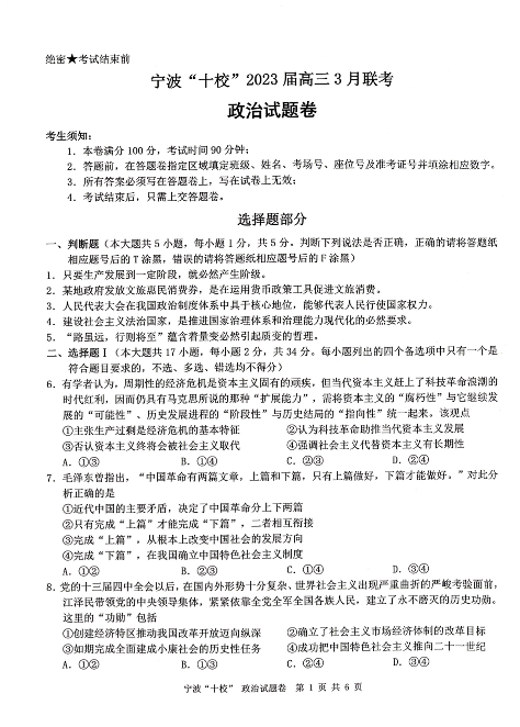 高三政治--浙江省宁波市十校2023届高三下学期3月(二模)