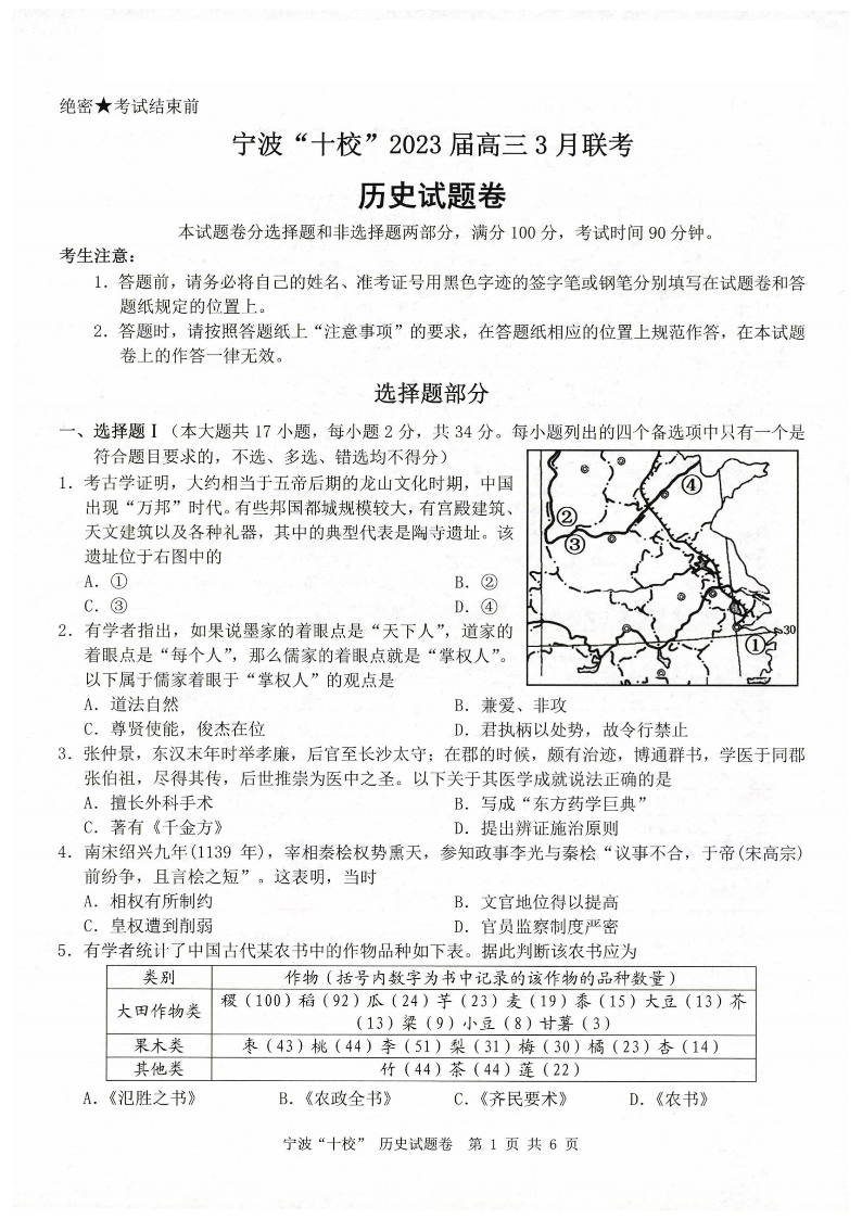 高三历史--浙江省宁波市十校2023届高三下学期3月(二模)