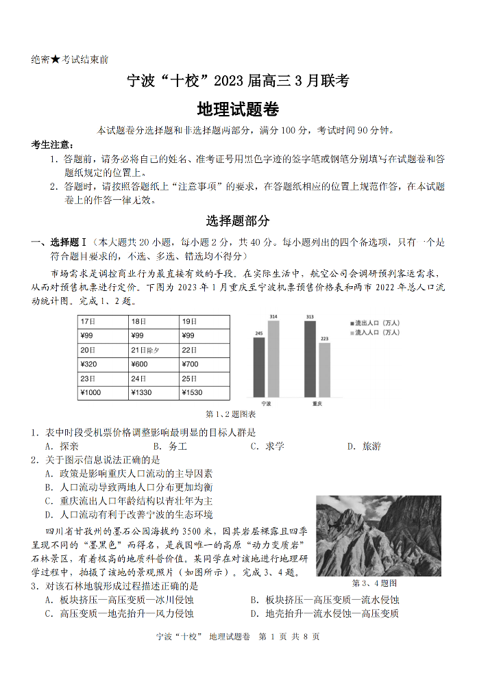 高三地理--浙江省宁波市十校2023届高三下学期3月(二模)