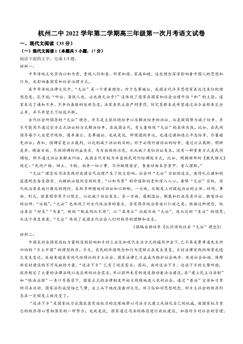 高三语文+答案--浙江省杭州第二中学2023高三下学期3月月考