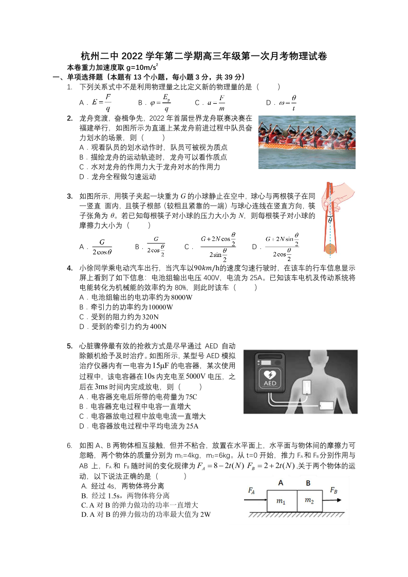 高三物理--浙江省杭州第二中学2023高三下学期3月月考