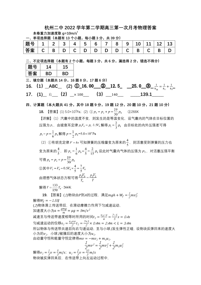高三物理答案--浙江省杭州第二中学2023高三下学期3月月考