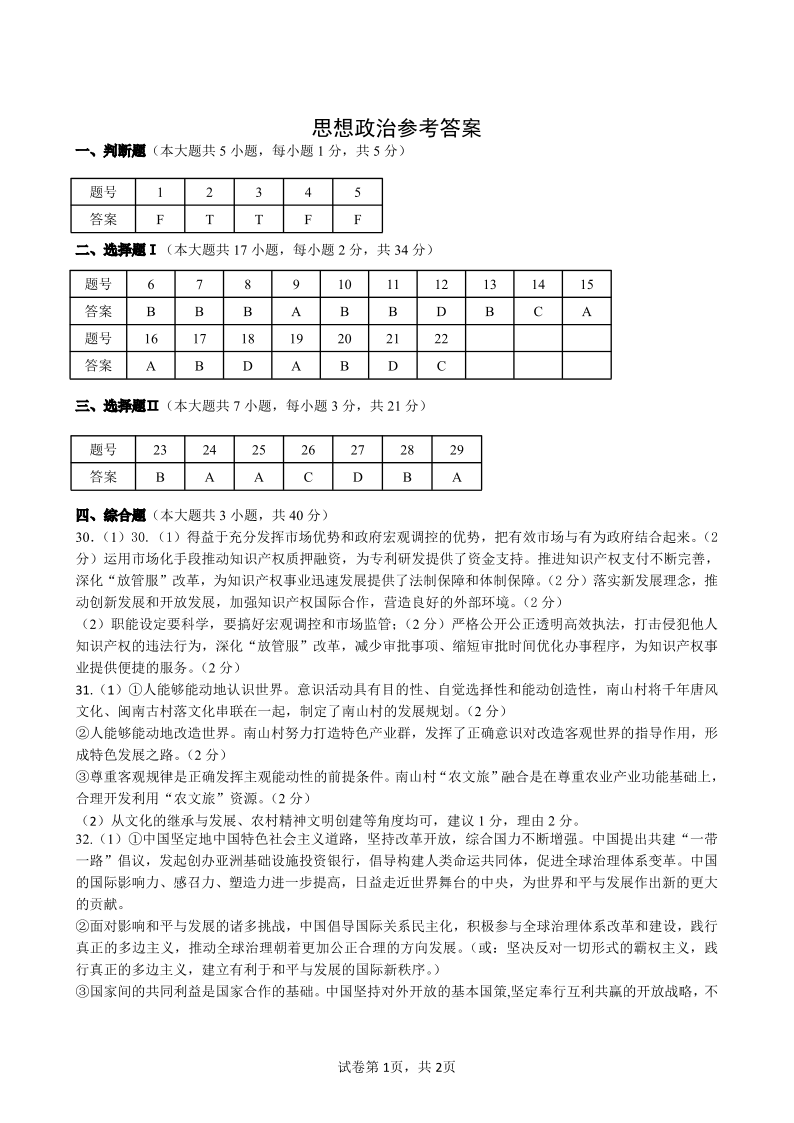高三政治答案--浙江省杭州第二中学2023高三下学期3月月考