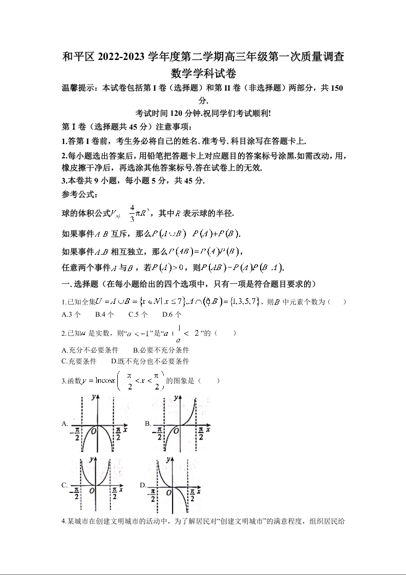 高三数学--天津市和平区2023高三下学期一模