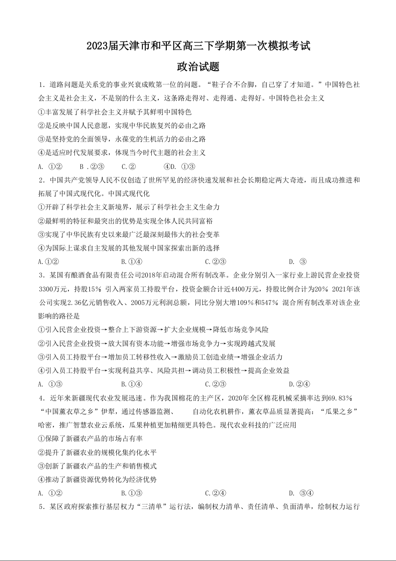 高三政治--天津市和平区2023高三下学期一模