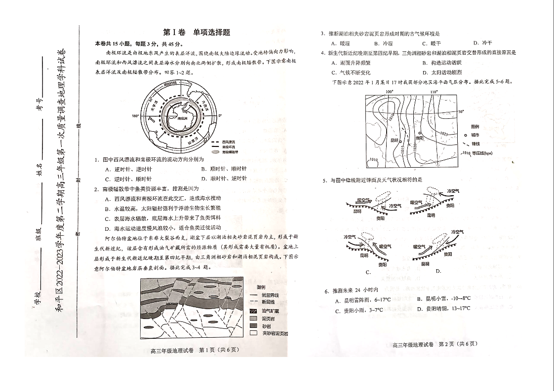高三地理--天津市和平区2023高三下学期一模