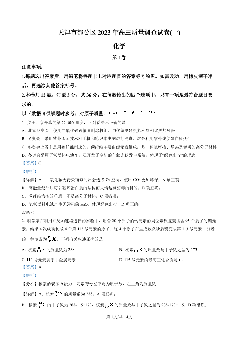高三化学(解析版)--天津市部分区2023届高三质量调查(一)