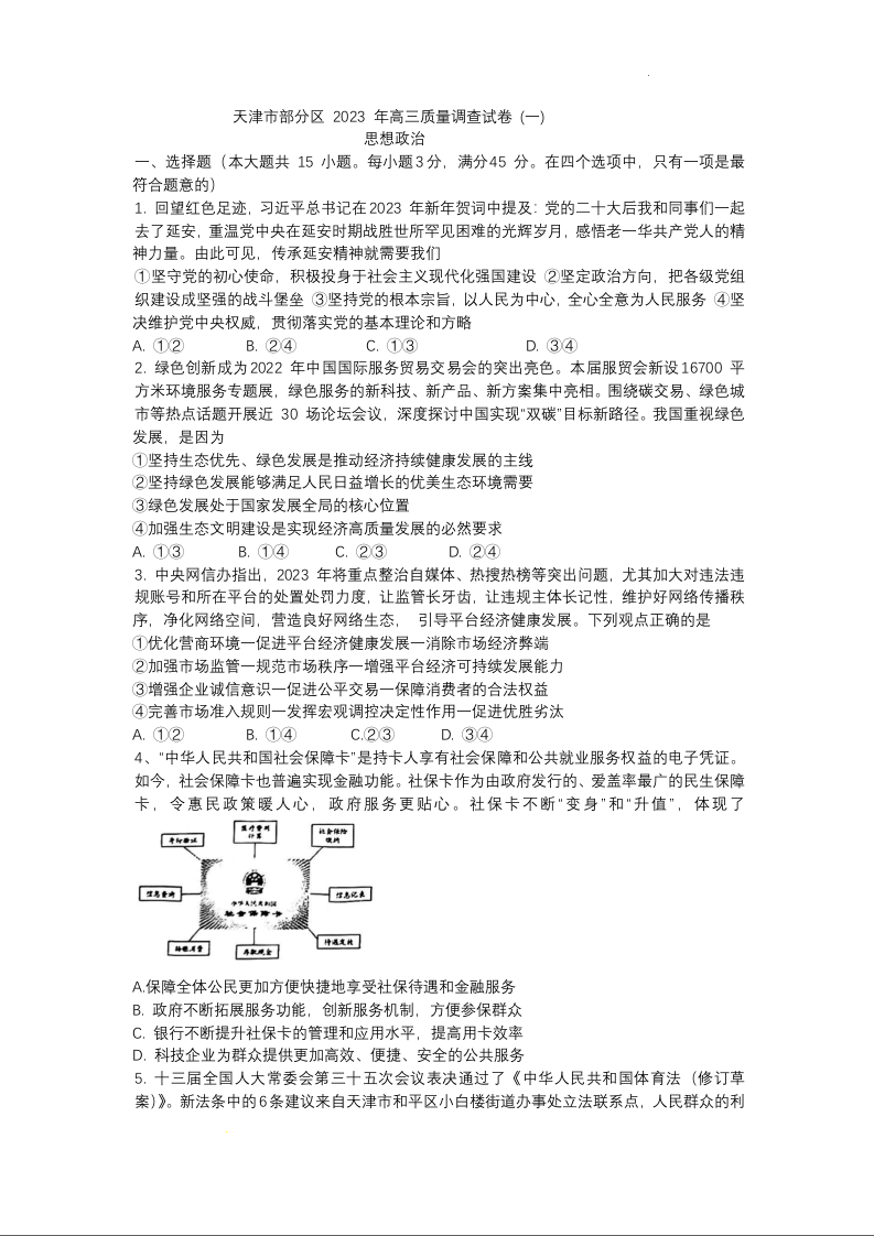高三政治--天津市部分区2023届高三质量调查(一)