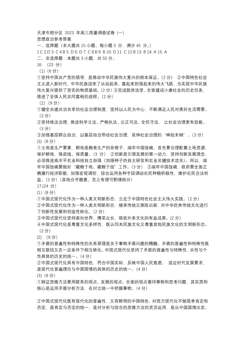 高三政治答案--天津市部分区2023届高三质量调查(一)