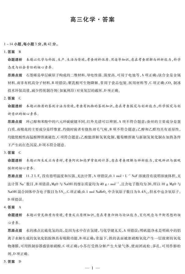高三化学答案--湖南省天一大联考2026届高三上学期阶段性检测(一)