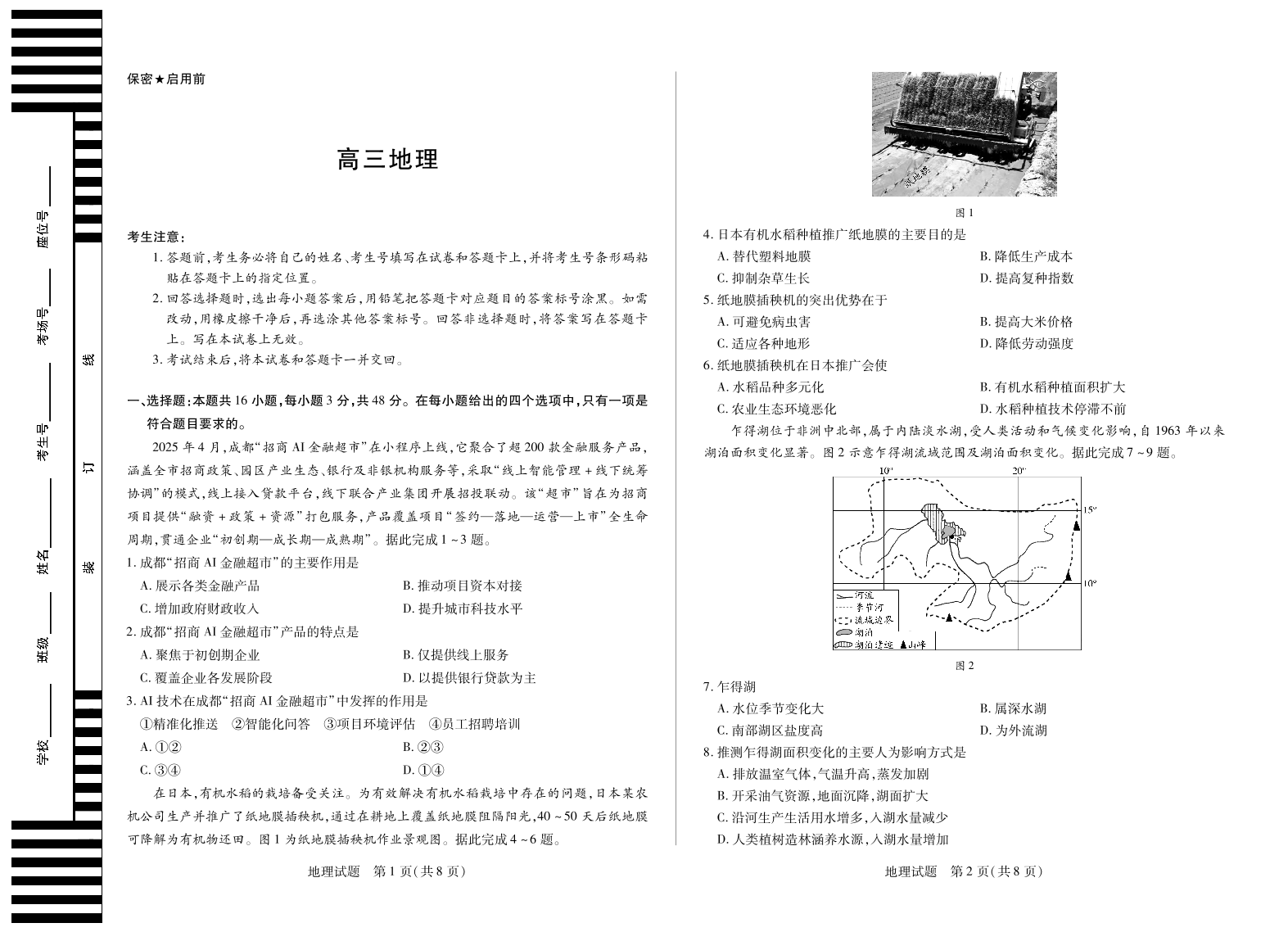 高三地理--湖南省天一大联考2026届高三上学期阶段性检测(一)