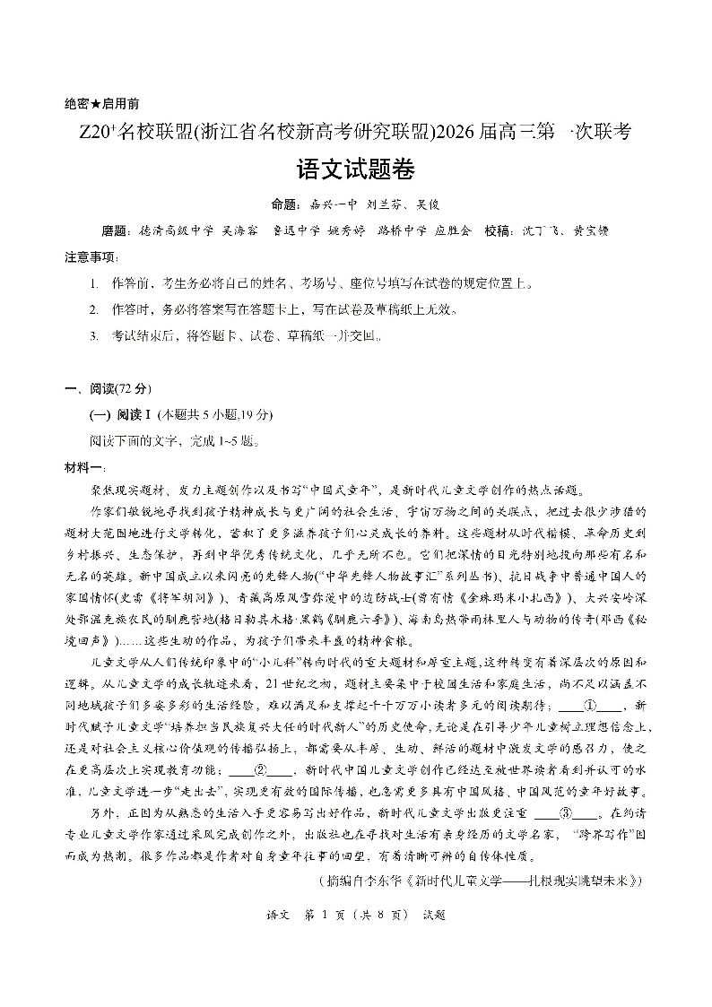 高三语文--浙江省 Z20(名校新高考研究联盟)2026届高三第一次联考