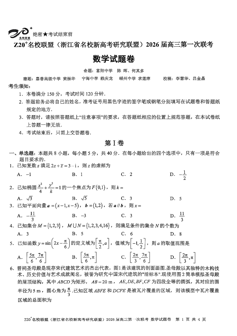 高三数学--浙江省 Z20(名校新高考研究联盟)2026届高三第一次联考