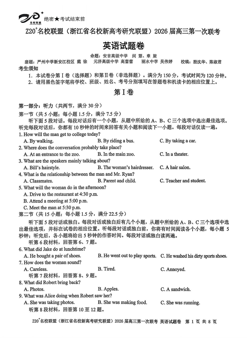 高三英语--浙江省 Z20(名校新高考研究联盟)2026届高三第一次联考