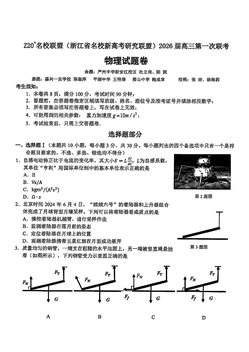 高三物理--浙江省 Z20(名校新高考研究联盟)2026届高三第一次联考