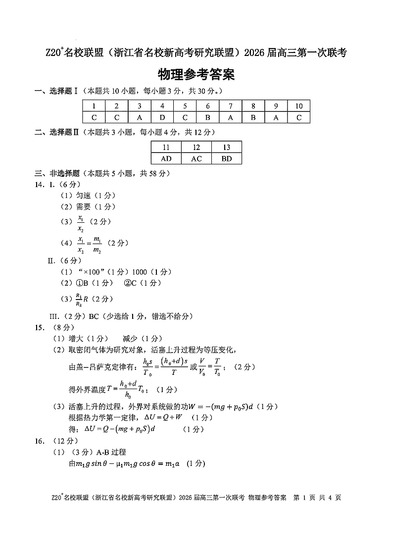 高三物理答案--浙江省 Z20(名校新高考研究联盟)2026届高三第一次联考