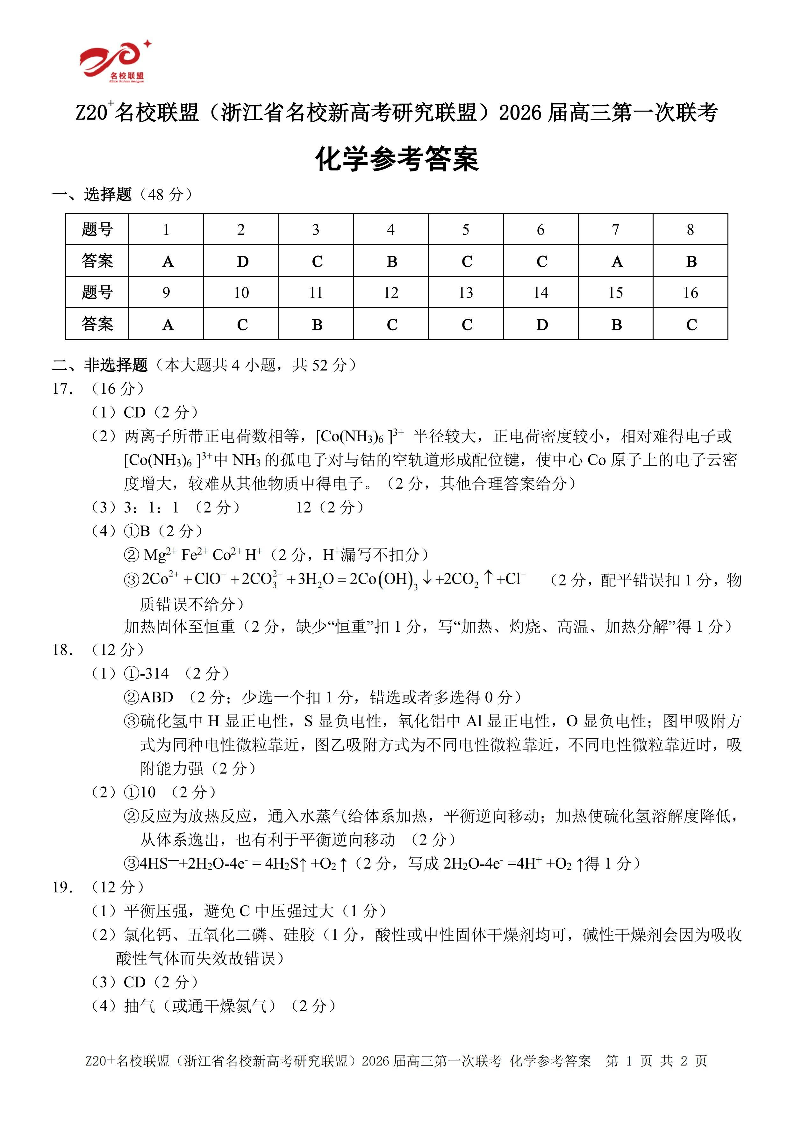 高三化学答案--浙江省 Z20(名校新高考研究联盟)2026届高三第一次联考