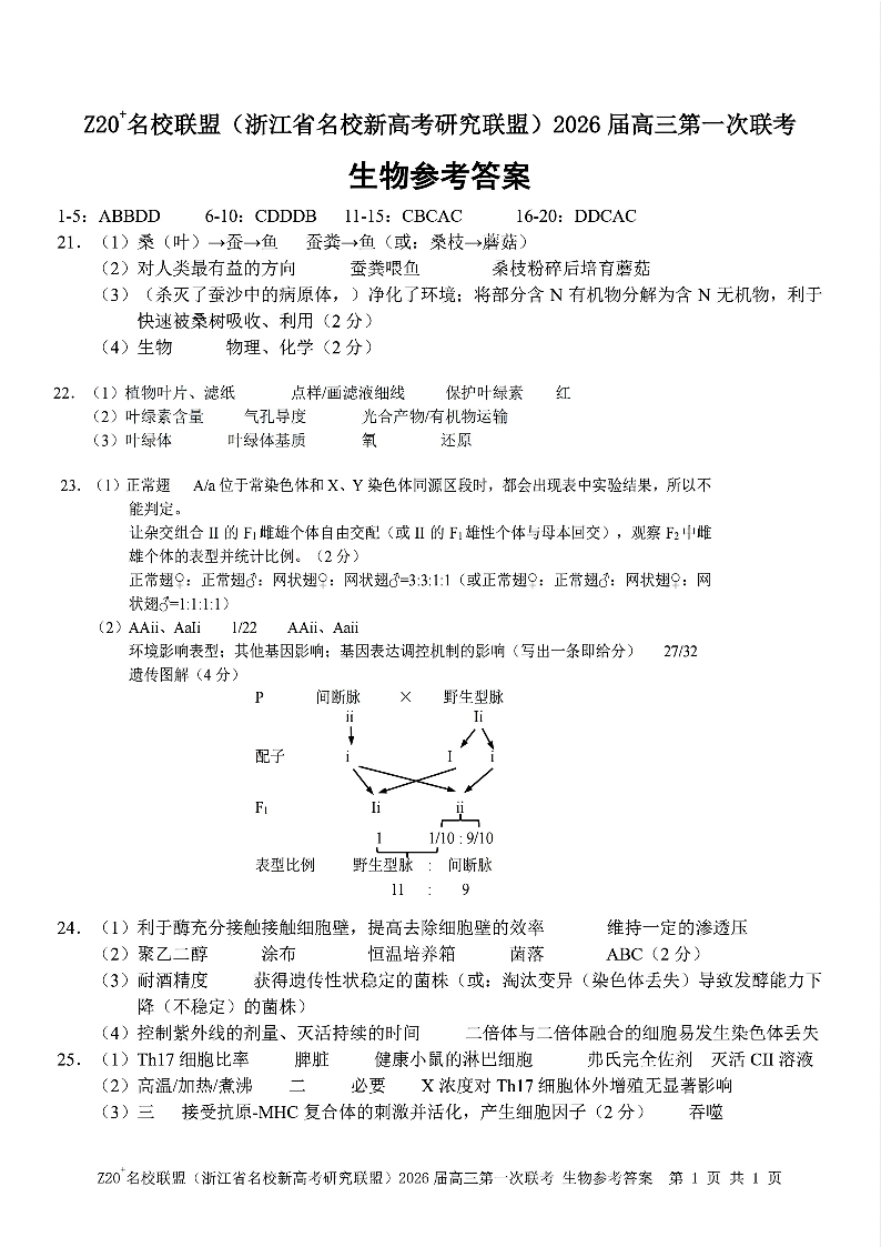 高三生物答案--浙江省 Z20(名校新高考研究联盟)2026届高三第一次联考