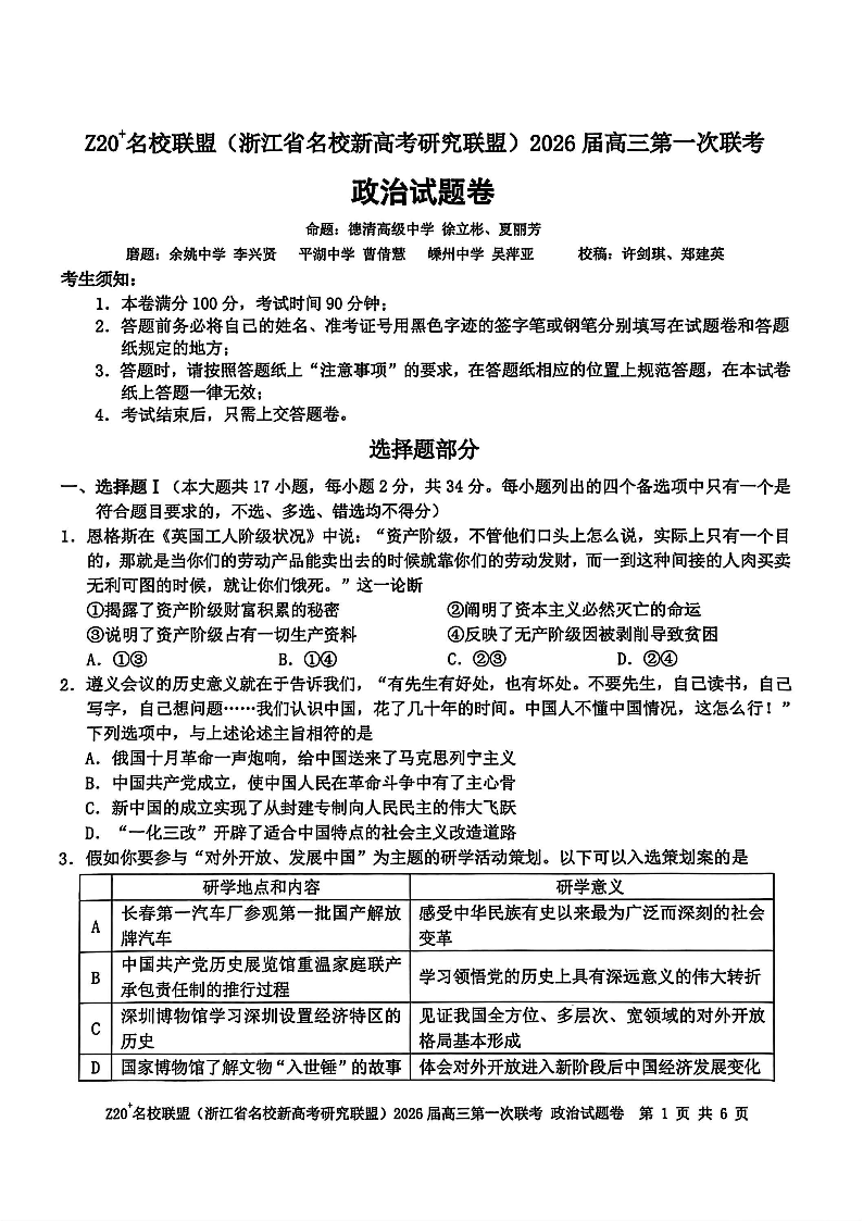 高三政治--浙江省 Z20(名校新高考研究联盟)2026届高三第一次联考