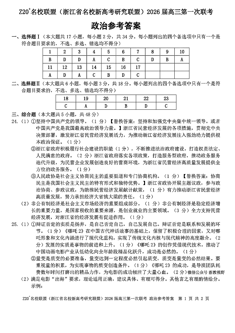高三政治答案--浙江省 Z20(名校新高考研究联盟)2026届高三第一次联考