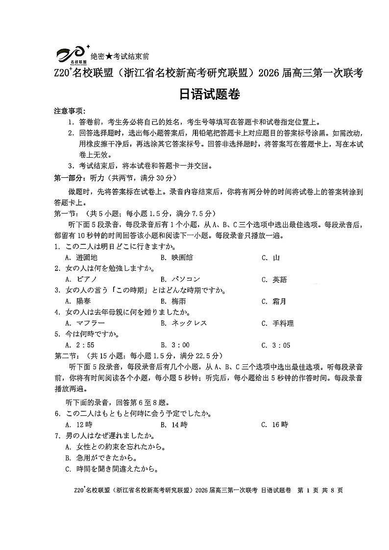 高三日语--浙江省 Z20(名校新高考研究联盟)2026届高三第一次联考