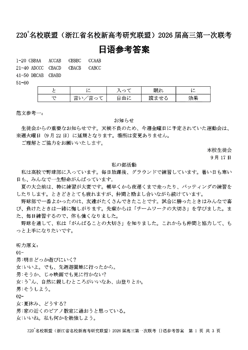 高三日语答案--浙江省 Z20(名校新高考研究联盟)2026届高三第一次联考