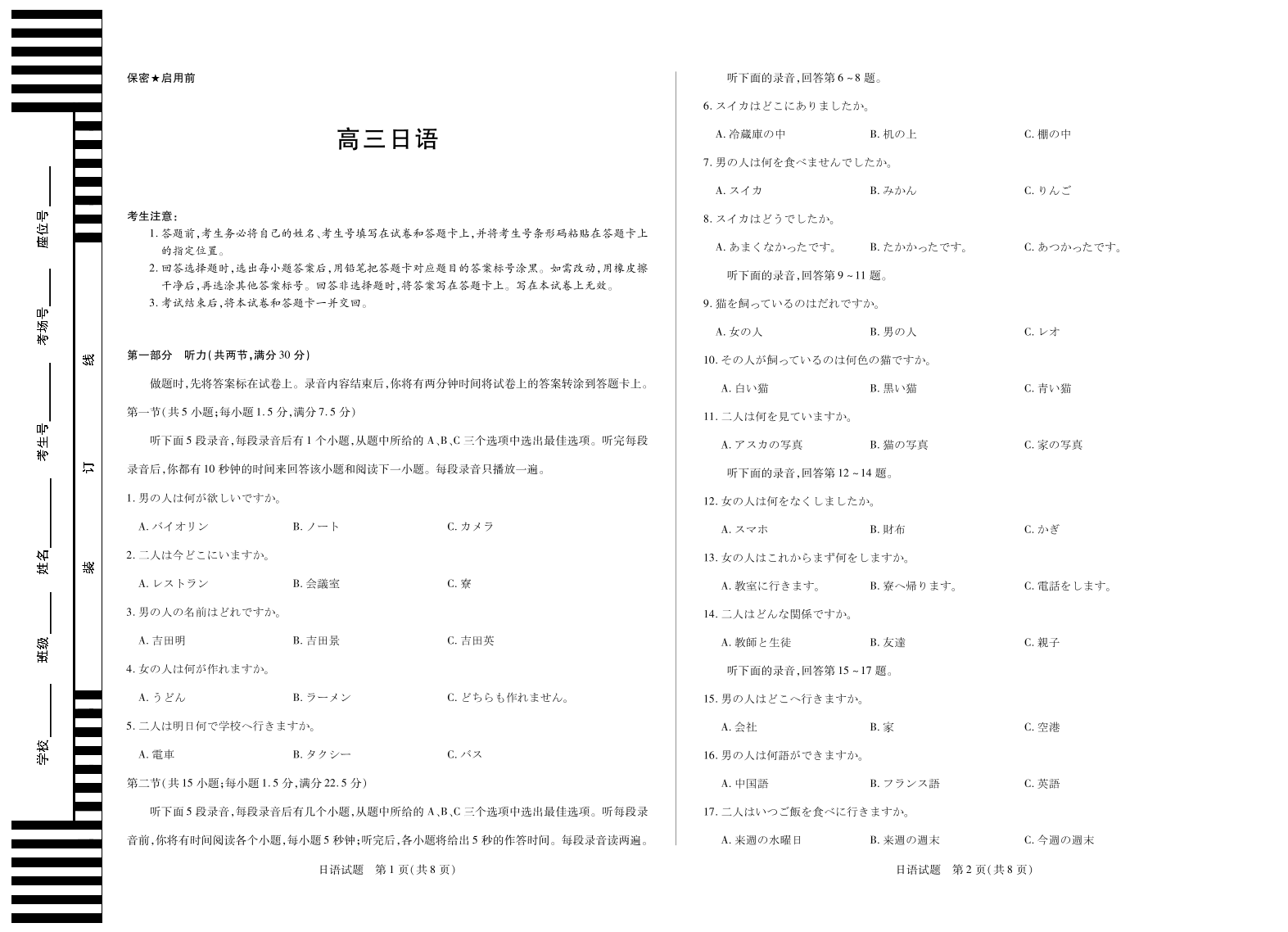 高三日语--湖南省天一大联考2026届高三上学期阶段性检测(一)