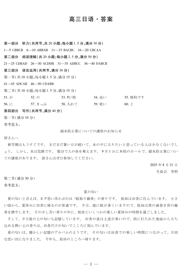 高三日语答案--湖南省天一大联考2026届高三上学期阶段性检测(一)