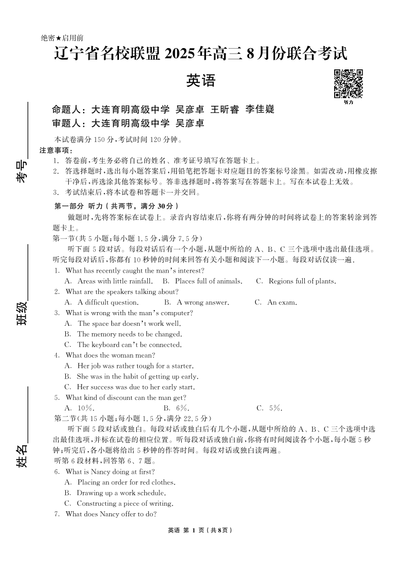 高三英语--辽宁省名校联盟2025-2026学年高三上学期8月份联合考试