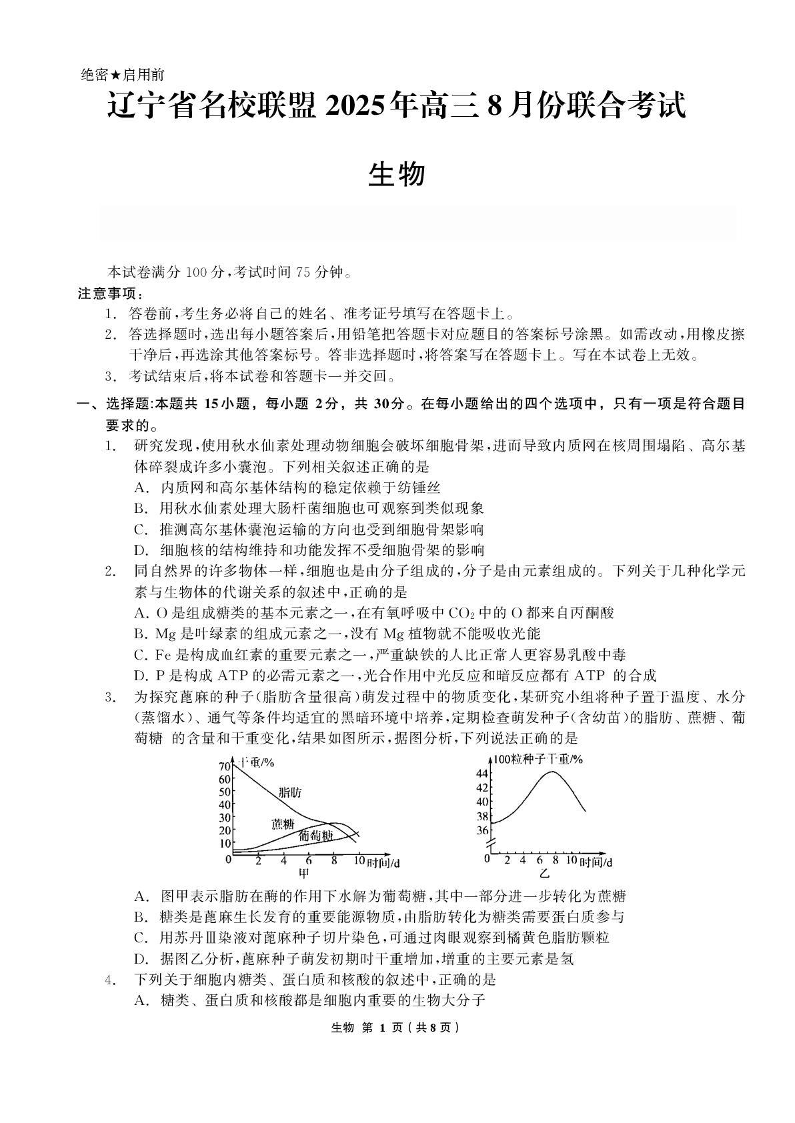 高三生物--辽宁省名校联盟2025-2026学年高三上学期8月份联合考试