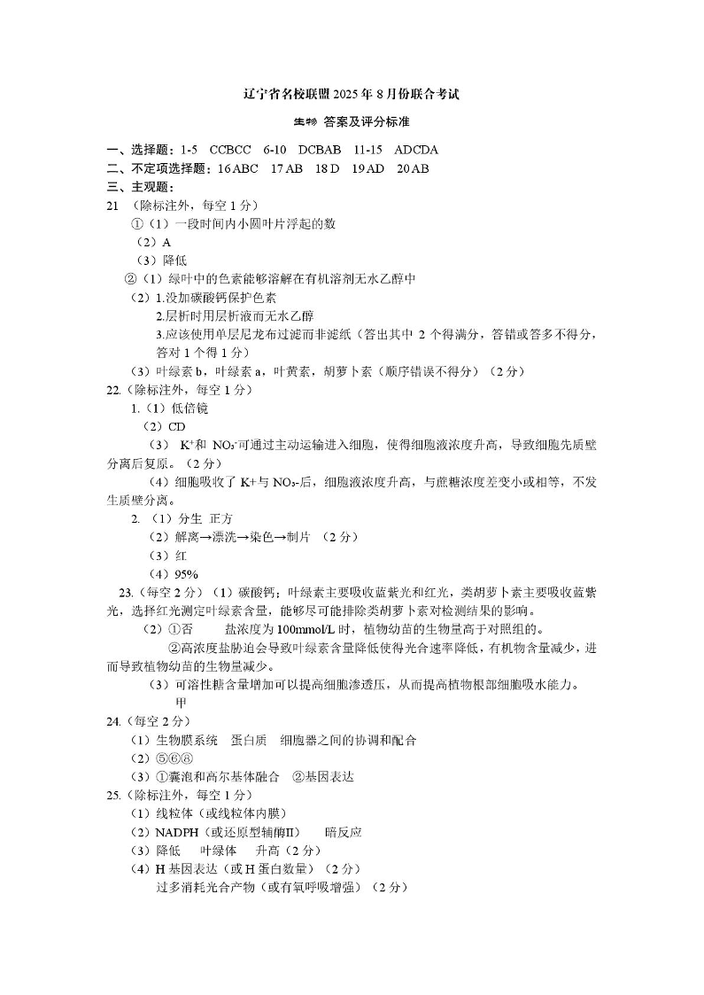 高三生物答案--辽宁省名校联盟2025-2026学年高三上学期8月份联合考试