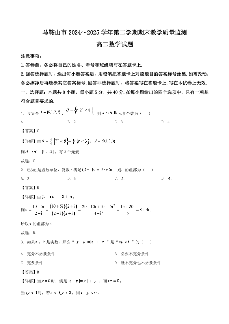 高二数学+答案--安徽省马鞍山市2024-2025学年高二下学期期末考试