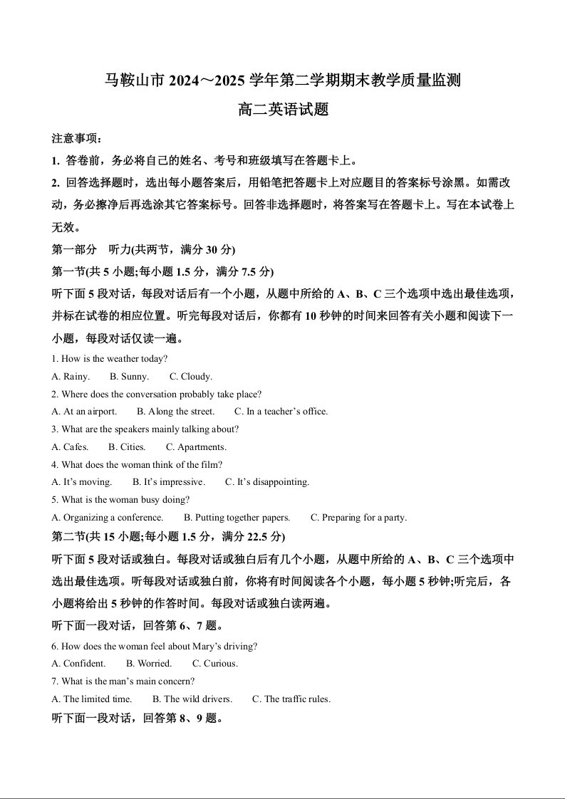 高二英语+答案--安徽省马鞍山市2024-2025学年高二下学期期末考试