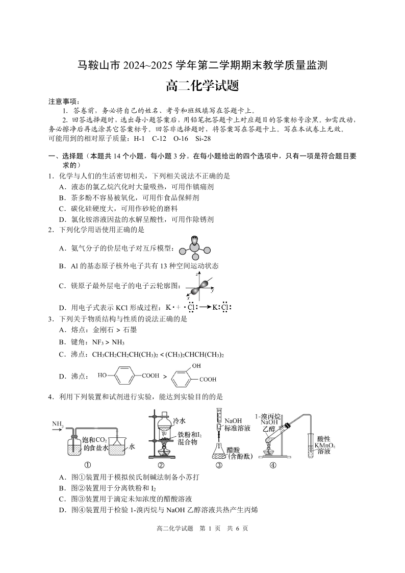高二化学+答案--安徽省马鞍山市2024-2025学年高二下学期期末考试