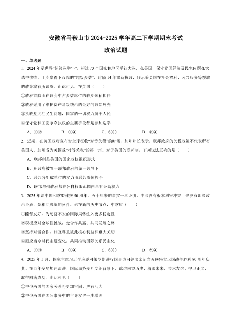 高二政治+答案--安徽省马鞍山市2024-2025学年高二下学期期末考试