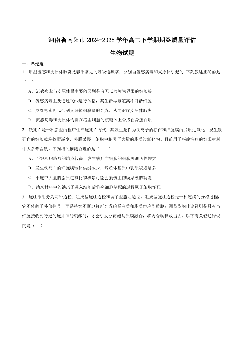 高二生物+答案--河南省南阳市2024-2025学年高二下学期期末考试