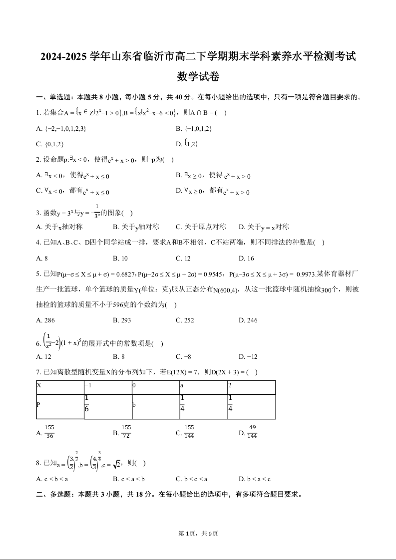 高二数学+答案--山东省临沂市2024-2025学年高二下学期期末素养水平检测考试